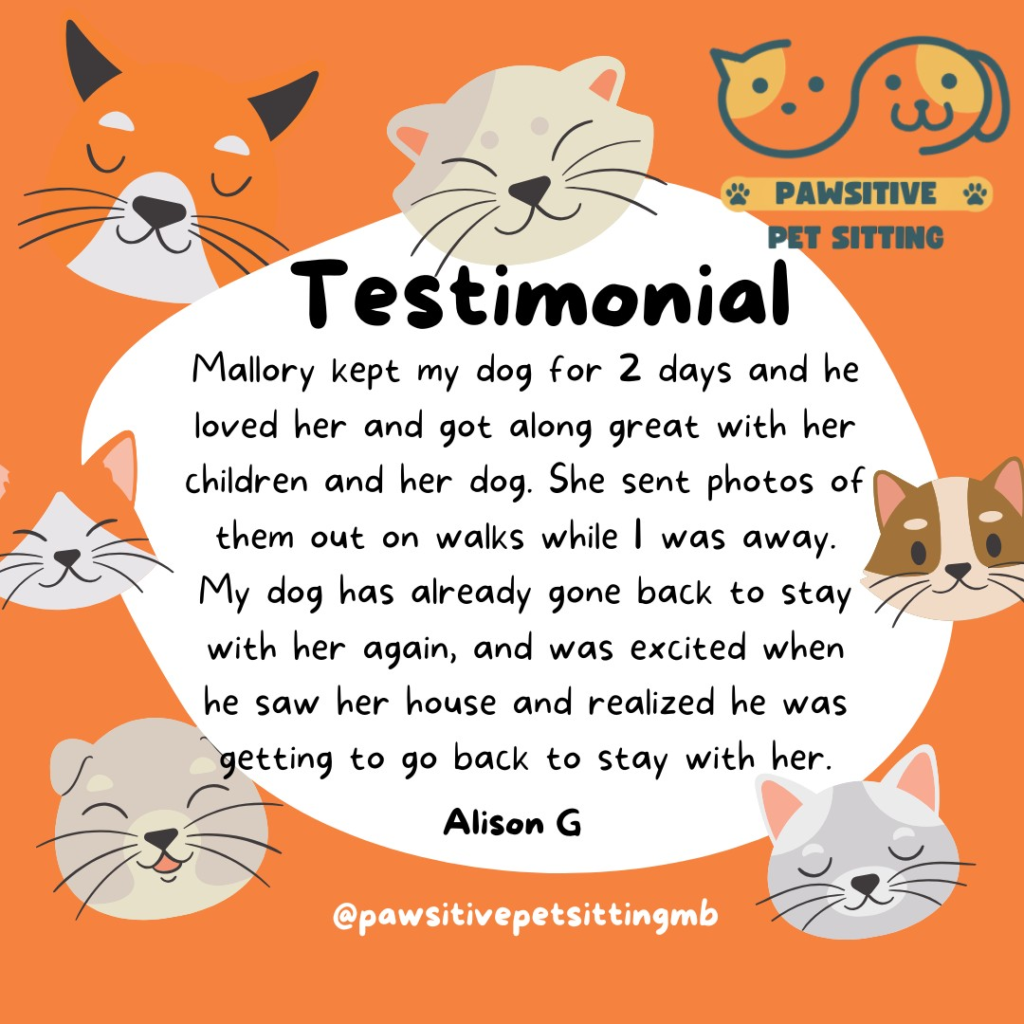 Pawsitive Pet Sitting has been a lifesaver for my family! The care and attention my pets receive is unmatched. I can always count on them for reliable and loving service. My dogs come home happy and well-cared for after every visit! Highly recommend!